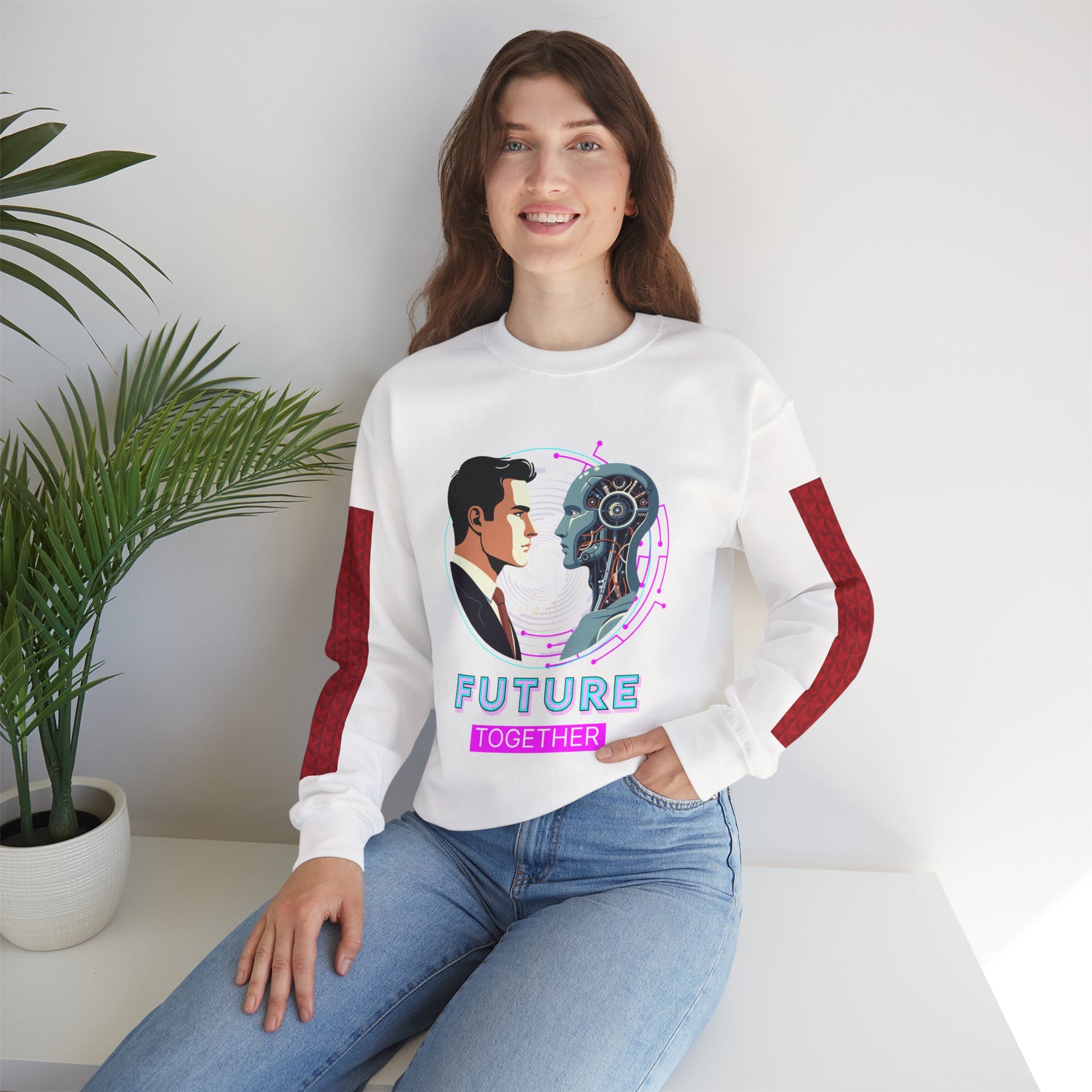 Soft, roomy, and quietly futuristic — this crewneck brings a human touch to tech-forward style. A crisp white base showcases a vintage-meets-cyber illustration: a suave human profile facing a detailed robotic head, linked by subtle circuit accents and the neon caption “FUTURE” over a highlighted “TOGETHER.” Slim contrasting panels run down each sleeve for an athletic, retro vibe. Wear it to signal curiosity about tomorrow while staying comfortable in the present. It layers easily over a tee for late-night coding sessions, coffee shop debates about AI, or casual weekend strolls when you want a thoughtful graphic that starts conversations.